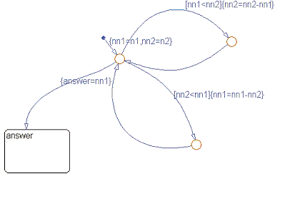 Модель работы алгоритма Евклида. Моделирование работы компьютера, реализующего известного алгоритма Евклида по нахождению наибольшего общего делителя двух натуральных чисел. Этот ставший классическим пример разветвляющегося алгоритма можно представить в виде блок-схемы, представленной на рисунке. Stateflow-моделью работы этого алгоритма может служить показанная на следующем рисунке диаграмма. При моделировании свободно программируемых устройств STATEFLOW - эффективный способ представить общую структуру программного кода как конструкцию в виде условных операторов и циклов Далее на основе этой диаграммы создаем Simulink-модель, обеспечивающую ввод и вывод информации. Конечный результат работы модели на заданном ей наборе данных показан на рисунке. Наибольшим общим делителем заданных на входе в диаграмму чисел 121 и 22 является число 11. \